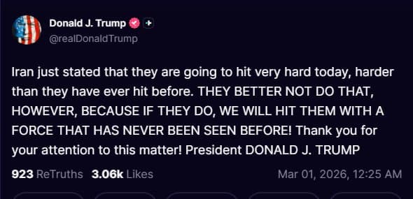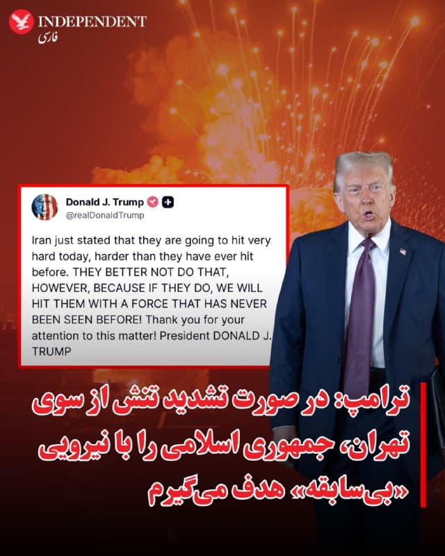 ترامپ در شبکه اجتماعی تروث نوشت: «تهران همین الان اعلام کرده است که امروز حملهای بسیار شدید انجام خواهد داد، شدیدتر از هر زمان دیگری. اما بهتر است چنین کاری نکند، چون اگر انجام دهد، ما آنها را با نیرویی هدف قرار خواهیم داد که هرگز پیش از این دیده نشده است!»