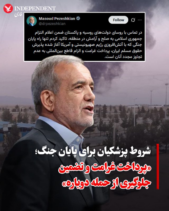 ♦️ مسعود پزشکیان، رئیسجمهوری اسلامی، روز چهارشنبه ۲۰ اسفند در شبکه اجتماعی اکس نوشت که در تماسهایی با روسای دولتهای روسیه و پاکستان درباره شروط تهران برای پایان جنگ گفتوگو کرده است. او در این پیام نوشت که جمهوری اسلامی با وجود تاکید بر صلح و آرامش در منطقه، پایان جنگ را مشروط به سه موضوع میداند: «پذیرش حقوق مسلم ایران، پرداخت غرامت و تضمین قاطع بینالمللی برای جلوگیری از هرگونه حمله دوباره». پزشکیان این جنگ را نتیجه «آتشافروزی اسرائیل و آمریکا» توصیف کرد. ساعاتی پیش از این نیز مقامهای عمانی از تماس تلفنی پزشکیان با سلطان هیثم بن طارق خبر داده بودند. در این گفتوگو، سلطان عمان بر موضع بیطرفانه کشورش تاکید کرد و با ابراز نارضایتی از حملات و اقداماتی که خاک عمان را هدف قرار دادهاند، آنها را محکوم کرد. او همچنین گفت دولت عمان همه اقدامات لازم را برای حفظ امنیت و ثبات کشور انجام خواهد داد. 🇸🇦 Indypersian 🤖 @VahidOOnLine