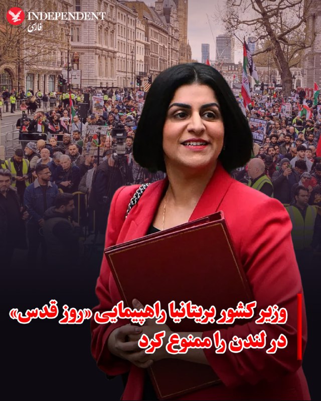 ♦️ شبانه محمود، وزیر کشور بریتانیا، با درخواست پلیس لندن برای ممنوعیت راهپیمایی برنامهریزی شده «روز قدس» برای روز یکشنبه ۲۴ اسفند، موافقت کرد. این تصمیم با هدف «جلوگیری از بینظمی شدید عمومی» اتخاذ شده است.