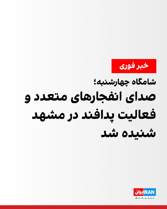 بر اساس گزارشهای رسیده به ایراناینترنشنال و خبرهای منتشرشده در رسانههای ایران، شامگاه چهارشنبه پنجم فروردین صدای انفجارهایی در برخی نقاط شهر مشهد شنیده شده است. بر اساس گزارش رسانههای ایران، در برخی مناطق، از جمله فرودگاه هاشمینژاد و حرم امام هشتم شیعیان، صدای شلیک پدافند گزارش شده است. همچنین پیامهای رسیده از مخاطبان ایراناینترنشنال حاکی است که شامگاه چهارشنبه، از حوالی ساعت ۲۱ تا ۲۱:۱۵، صدای چند انفجار شدید در محدوده «بلوار نماز» و نیز انفجارهایی در محدوده کوهسنگی و چند نقطه دیگر شنیده شده و دو جنگنده نیز در ارتفاع پایین در حال پرواز مشاهده شدهاند. 🏁 🇬🇧 IranintlTV 🤖 @VahidOOnLine