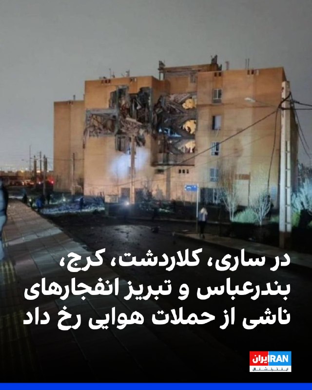 گزارشهای دریافتی از ادامه شنیده شدن صدای انفجار و پرواز جنگندهها در شامگاه یکشنبه در چندین شهر ایران حکایت دارد. بر اساس این گزارشها، در مناطق ۱۴، ۱۵ و ۱۶ از جمله خیابان فداییان اسلام انفجار شدید رخ داد که به شکستن شیشه برخی منازل انجامید. همچنین محدودههای پارچین، اتوبان قم، حکیمیه، نارمک، بلوار دهحقی، میدان شاهد، حسینآباد، هروی، میدان سلماس یوسفآباد و جنوبشرق تهران هدف قرار گرفتند یا صدای انفجار در آنها شنیده شد. همزمان، قطعی گسترده برق در مناطق شرق تهران از جمله دماوند، پیروزی و نارمک گزارش شد. در رباطکریم نیز یک سوله در کنار کارخانه صبا باتری در جاده شهریار-ادران هدف قرار گرفت و آتشسوزی و دود غلیظ ایجاد شد. 🏁 🇬🇧 IranintlTV 🤖 @VahidOOnLine