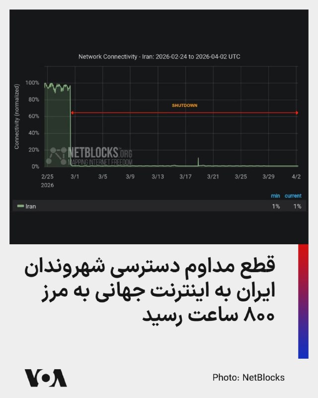 ⚡️خاموشی اینترنت در ایران از مرز ۷۹۲ ساعت گذشت و میلیونها شهروند ایرانی ۳۴ روز است که به اینترنت جهانی دسترسی ندارند. گروه مستقل نظارت بر دسترسی به اینترنت، «نتبلاکس»، روز پنجشنبه ۱۳ فروردین در گزارشی اعلام کرد که قطعی کامل اینترنت در ایران به سی و چهارمین روز خود رسید و این اقدام سانسور در مقیاس ملی وارد دومین ماه خود شده و از ۷۹۲ ساعت گذشته است. براساس گزارش نت بلاکس، خانوادهها و دوستان همچنان تا حد زیادی از دنیای خارج قطع هستند، در حالی که نگرانیها درباره تلفات جنگ، بازداشتها و اعدامها رو به افزایش است. 🇺🇸 FarsiVOA 🤖 @VahidHeadline